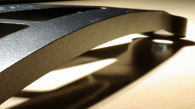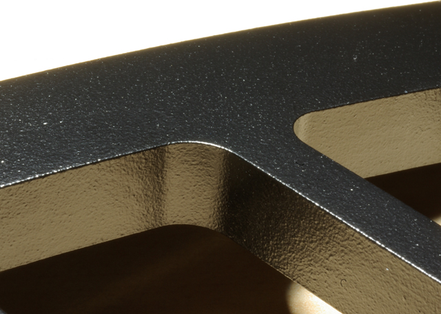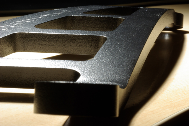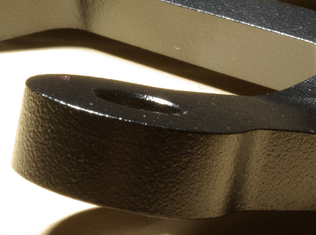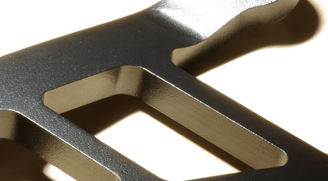 On the Evotech web site, there are images of the exhaust hanger, but you don't get a feel for the texture of the finish or the complexity of the machining. The machining on the side facing the wheel takes a great deal of the material out of the hanger without sacrificing strength. There is also a gentle curve that matches the OEM hanger perfectly.