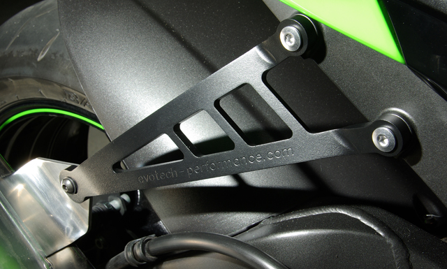 I was searching for some farkles for my 2008 Kawasaki ZX10R. I wanted a fender eliminator and an exhaust hanger. I wanted a fender eliminator to make using a track stand easier and I want to take off the rear foot-rests/exhaust-hanger in preparation for my "Zed-X-10-Argh" on the track. I will still use my ZX10R on the street, so I wanted to be able to use the stock taillights and license light as well as allowing for easy removal for the track. I’ve seen some of the cheap "tail-tidys" that are sold through eBay and in local stores and they fail to impress. The cheap "tail-tidys" are little more than a bracket where I can place non-DOT (Department of Transportation) lights. If I use non-DOT lights, I run the risk of being hassled by the law. Searching the Internet, I want items of high quality that look as good as OEM and use OEM hardware. I found items at Evotech and they have what I was looking for.