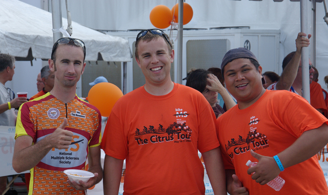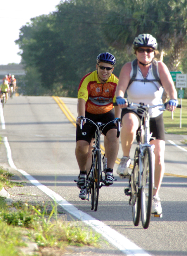 Not wanting to create a problem, I was super nice and respectful, but I had to wait for Tracy. I told the Sheriff that I was going to wait for my friend, and that I was on public property so I was doing no wrong. In saying that, I realized that I was right at the edge of him making a scene and me getting into deeper trouble. Thank goodness I am an ex-bicycle racer as several folks from the Florida Freewheelers who I used to ride with, saw me and came up and gave me a hug! The Sheriff saw this and a few of the people that I had helped come up and thank me while I was standing there. In an instant, the Sheriff realized that he had been given bogus information (Gee, I wonder from whom!?!) about me being out there. He was doing his job and since his wife was also there in a beach chair, I was given a reprieve from anything bad happening. We talked for a few more minutes and I used my best behavior to make sure he realized that I was one of the "Good-Guys". He turned out to be a nice guy and we even kept talking while I waited for Tracy to show up.