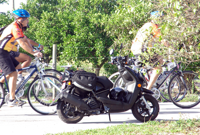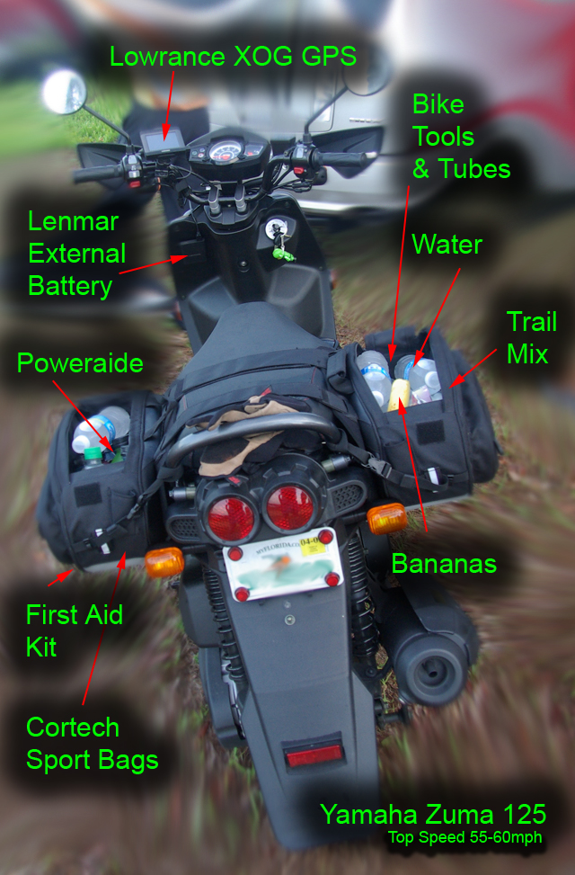 Ok, obviously a Zuma 125 is definitely a vehicle, but if they like motorcycles on the course, a Zuma 125 will not be a problem in the least bit! I thought about registering as an official vehicle, but I didn't want to explain to the organizers what a Zuma 125 was and what was it's capability. Sure, I could tell them I would use one of my Sport Touring machines (a Kawasaki ZZR1200), but as a bicyclist I know how slow I will go at times, and in Florida? A 1200cc motorcycle, will possibly overheat or not be able to stop along side the road in the sugar sand! A motorcycle is definitely NOT the best vehicle to take if I want to mix it up out there on the course and retain my safety and the safety of the bicycles. The Zuma, because of it's small size and mass is magnitudes better at being in close proximity to bicycles. The mass is less than a motorcycle. The emissions are less. The noise is less. Heck, with my Zuma out there, I will be a force for good!!!