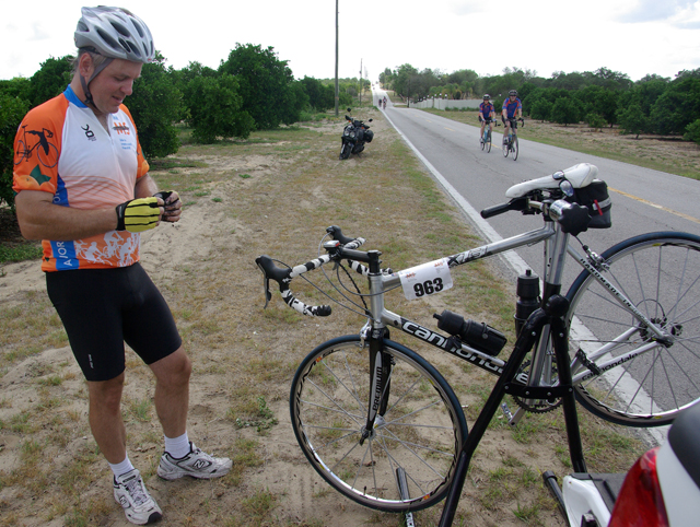 Chris asked me to hang back with Tracy, so I decided that I would follow her and speed up to get pictures of the rest of the team. After the first SAG stop, I never saw the guys until the end. It was me and Tracy for the rest of the day. Here, Tracy is thinking about what is in store for her the rest of the day. The temperature is starting to creep up and things are getting a little hot out there. The Zuma is doing GREAT!!! I am able to ride around and ask other riders if they are doing ok and if there is anything I can do. It feels great to be out there on the Zuma, although I was also wishing I was on my bicycle. Next year Bill will do the Zuma and I will be on the Bicycle!