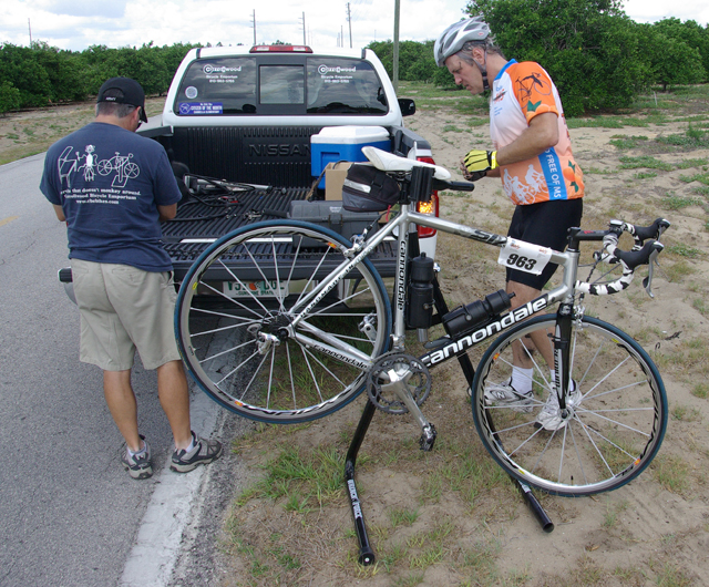 The guy in the truck said thanks, and he got on his walkie talkie and directed some folks to help the guy I pointed out. I walked over to the guy I told I'd help fix his bike and told him that I wouldn't be able to look his bike over and that the ride folks would be the ones to turn to. He said thanks, and was grateful that I was there, since I had also given him some water when we first met.