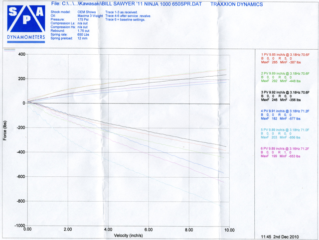The numbers were dramatic. The OEM shock, was barely up to the task of supporting a 503lbs bike with a rider! The parameters of the performance of the shock, in stock OEM form, had the spring too weak and not enough damping available.