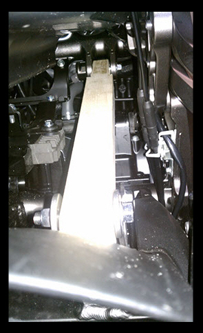 Our made-from-wood shock replacement while the shock is removed from the bike. Kudos to Bill for using his woodworking skills to make that cool tenon down at the other end of the picture below.