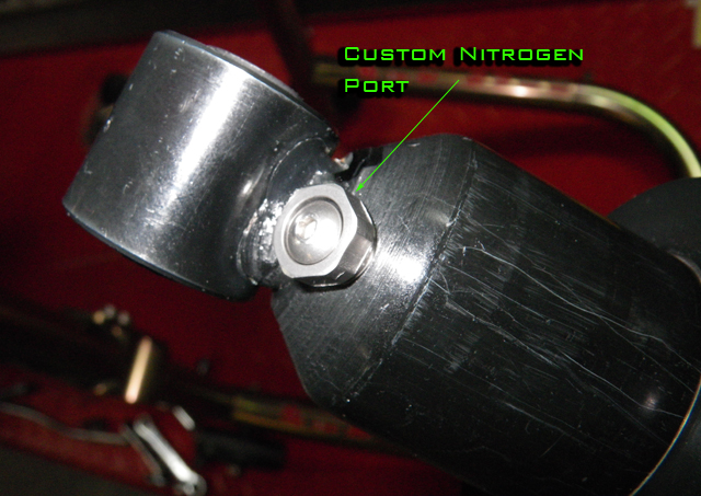 Martin also said that the parameters for the shock damping/compression were barely up to handling the spring. He recommended that he take the shock apart and change the valving. Our OEM shock was not rebuildable, so he said that he will drill a hole in the shock, de-pressurize it, change the internals - if possible - then add a nitrogen port to allow the shock to re built in the future.