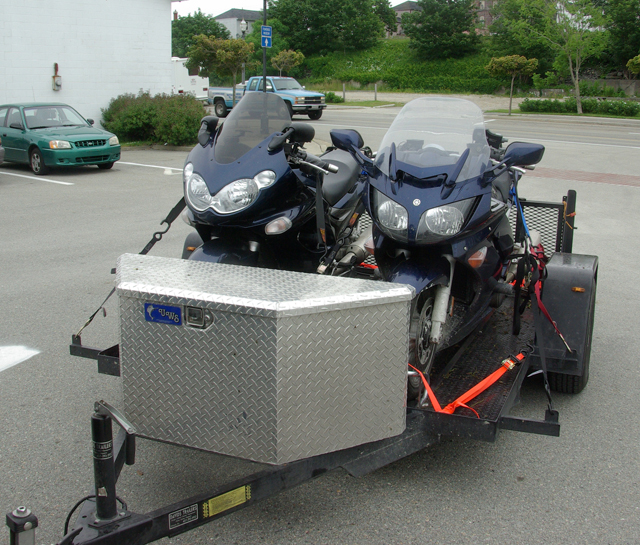 We placed the bikes back on the trailer in preparation for the trip back to Maine. We had left the trailer in Yarmouth, and it was great to get everything back together and secured.